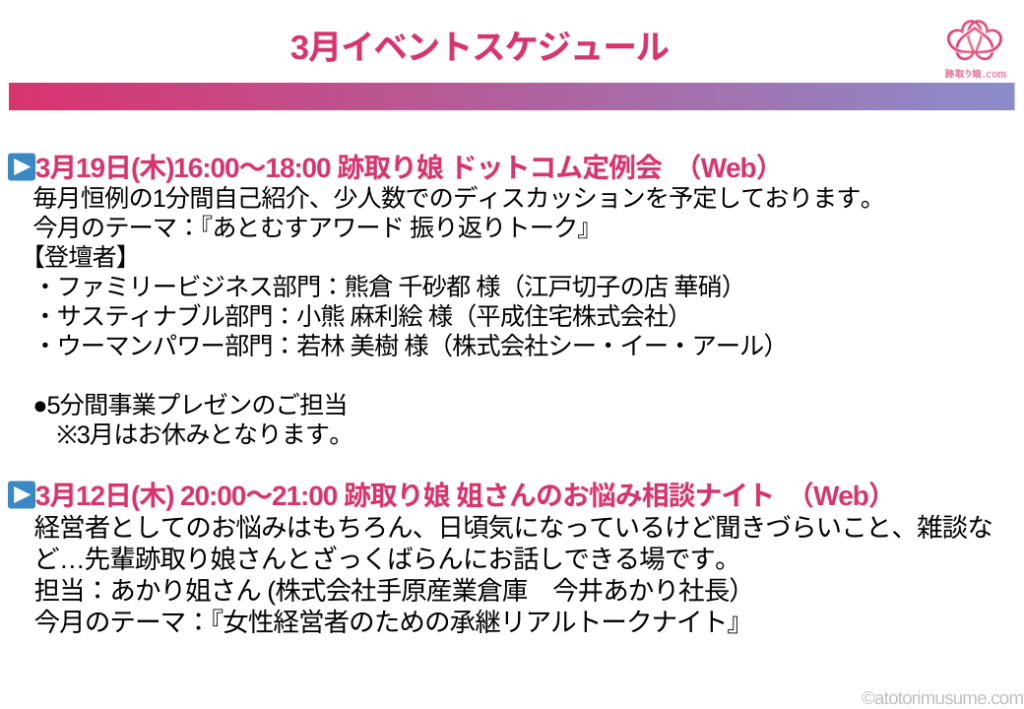 跡取り娘ドットコムより3月のイベントのご案内です。